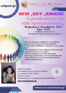 21 Οκτ ΚΥΡΙΑΚΗ 2 ΝΟΕΜΒΡΙΟΥ 2025 ” ΕΓΩ, ΕΣΥ, ΕΜΕΙΣ ” ΜΕ ΤΗΝ ΧΡΥΣΑ ΚΙΟΥΣΗ Posted at 20:00h in Νέα by Σύλλογος Γυναικών Αγ.Στεφάνου