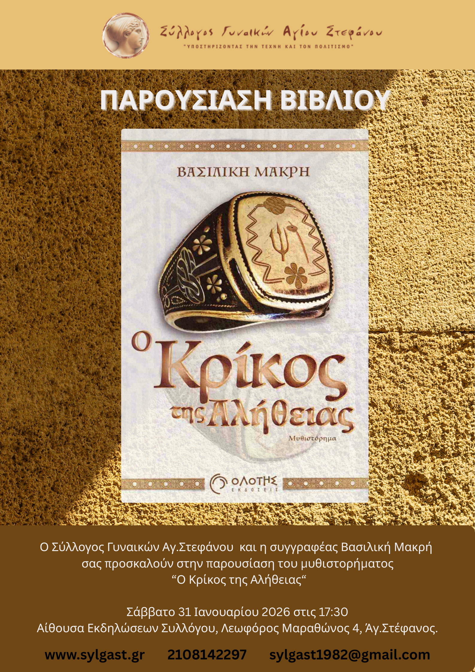 20 Ιαν ΠΑΡΟΥΣΙΑΣΗ ΒΙΒΛΙΟΥ – ΣΑΒΒΑΤΟ 31 ΙΑΝΟΥΑΡΙΟΥ 2026